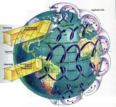 (A Föld légköri áramlataira vagy szélrendszereire, valamint a trópusi sarki területek közti energia- és csapadékmegoszlásra magyarázattal szolgáló modell. Forrás: www.vilaglex.hu)